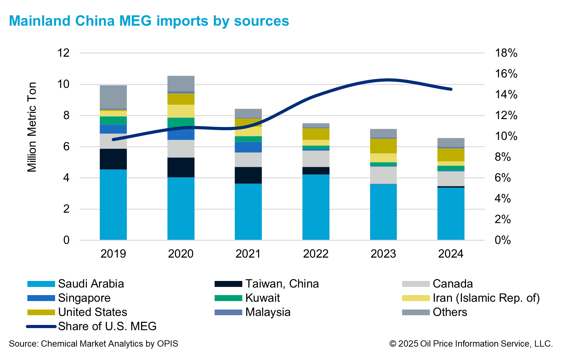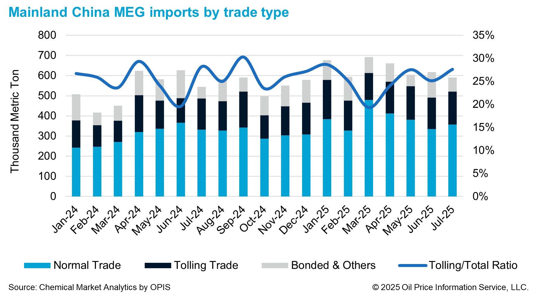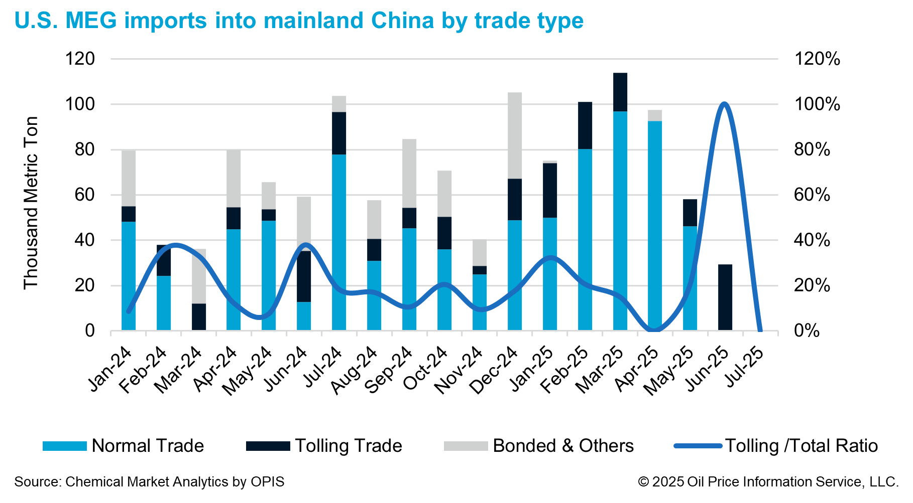 Whether for contract or spot volumes, mainland Chinese companies are expected to primarily import U.S. origin MEG under tolling trade category.