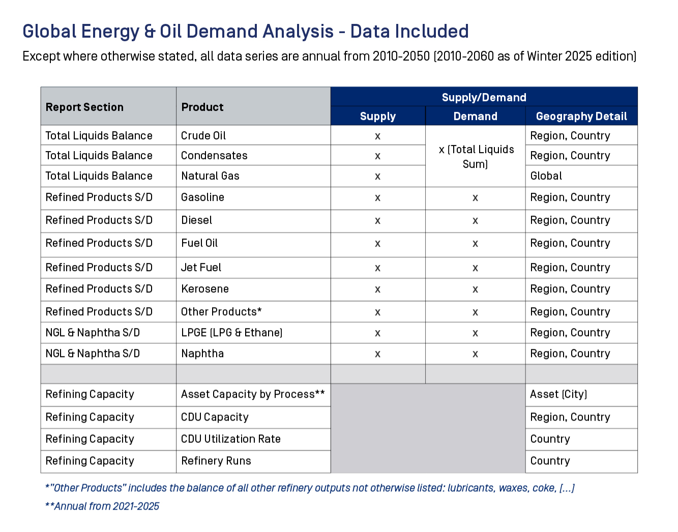 The Global Energy & Oil Demand Analysis delivers a fully integrated, long-range energy market forecast that connects crude oil, natural gas, NGLs, and refined products in one unified, data-rich platform. Built for strategic energy planning, this service provides a comprehensive oil and gas demand outlook through 2050 — broken down by product to enable more granular, downstream-driven strategies.